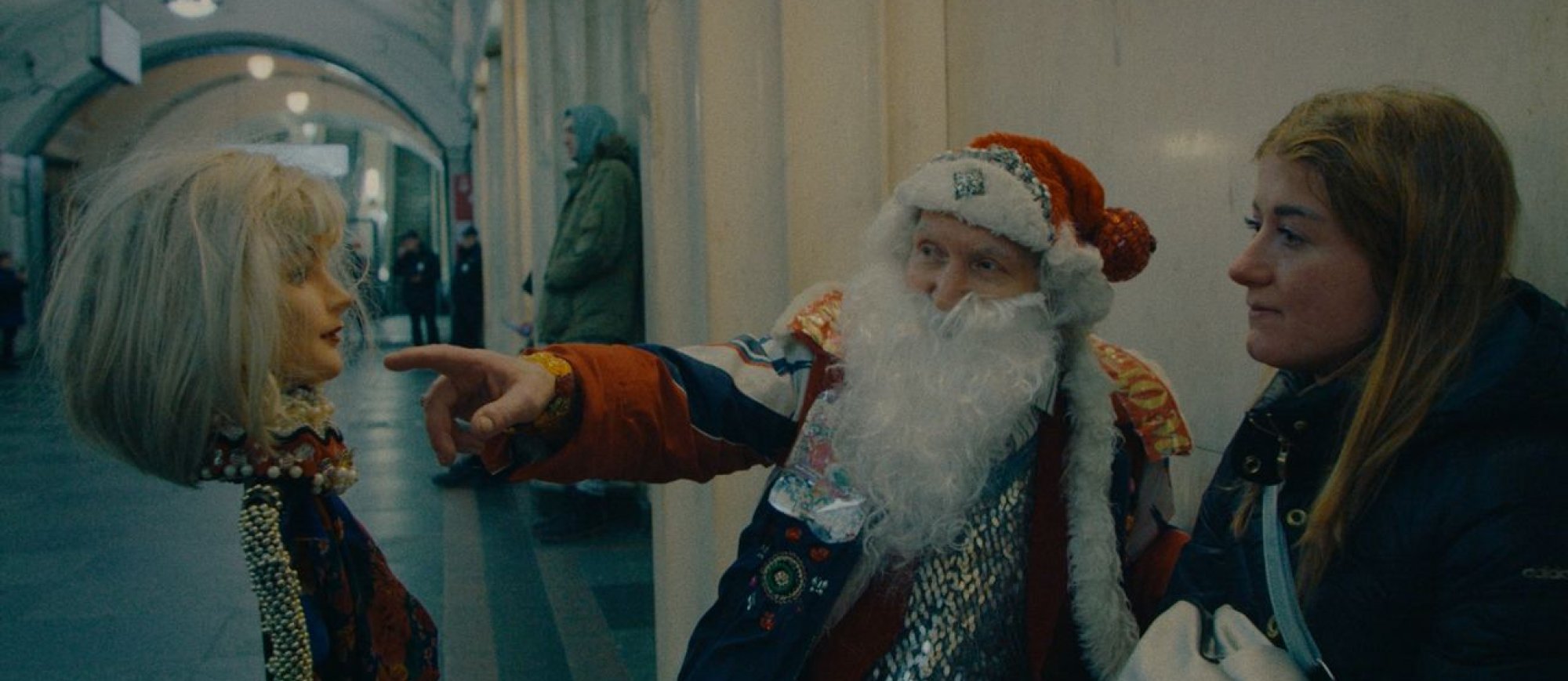 Дед Мороз, рассуждающий о Достоевском, песни в переходе, рьяные споры случайных собеседников на лавочках. Вестибюли станций с мраморными стенами и золотыми светильниками в фильме Руслана Федотова становятся гротескным фоном для трагикомедии абсурда: из случайных встреч складывается поэтическое эссе о современной России.